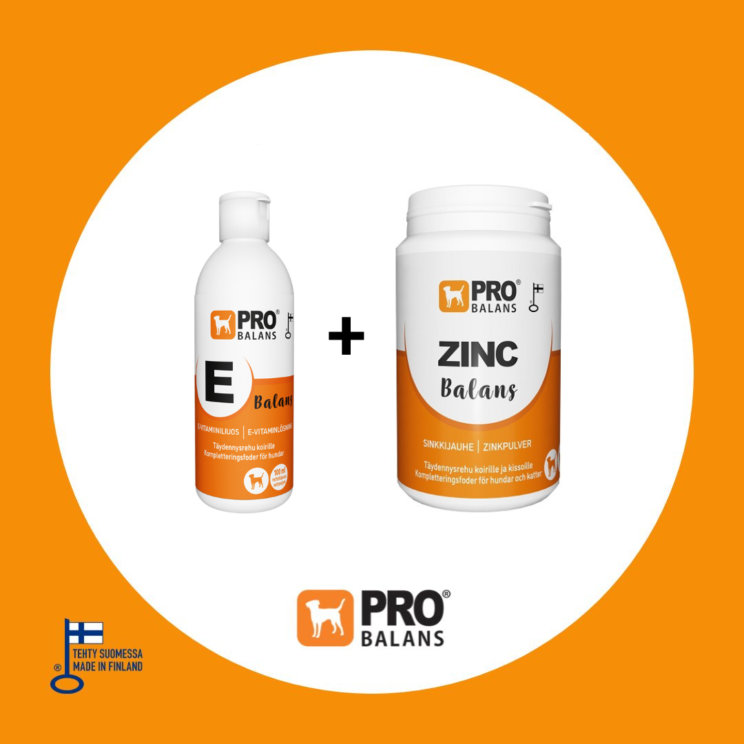 Talvi on erityisen rankkaa aikaa koiran iholle, turkille ja anturoille. Sinkki auttaa ylläpitämään turkin ja ihon hyvinvointia. Se on tehokas apu iho- ja turkkiongelmiin sekä kuiville anturoille ja halkeileville kynsille. Sinkki ja E-vitamiini ovat myös tarpeen myös koti- ja raakaruokinnassa ja 50/50-mallilla syöville koirille. Probalans E-balansin E-vitamiini ja seleeni suojaavat myös stressin vaikutuksilta ja voimistavat vastustuskykyä. E-vitamiinilisästä hyötyvätkin erityisesti iho- tai nivelongelmista kärsivät koirat sekä aktiiviset urheilu- ja harrastuskoirat.