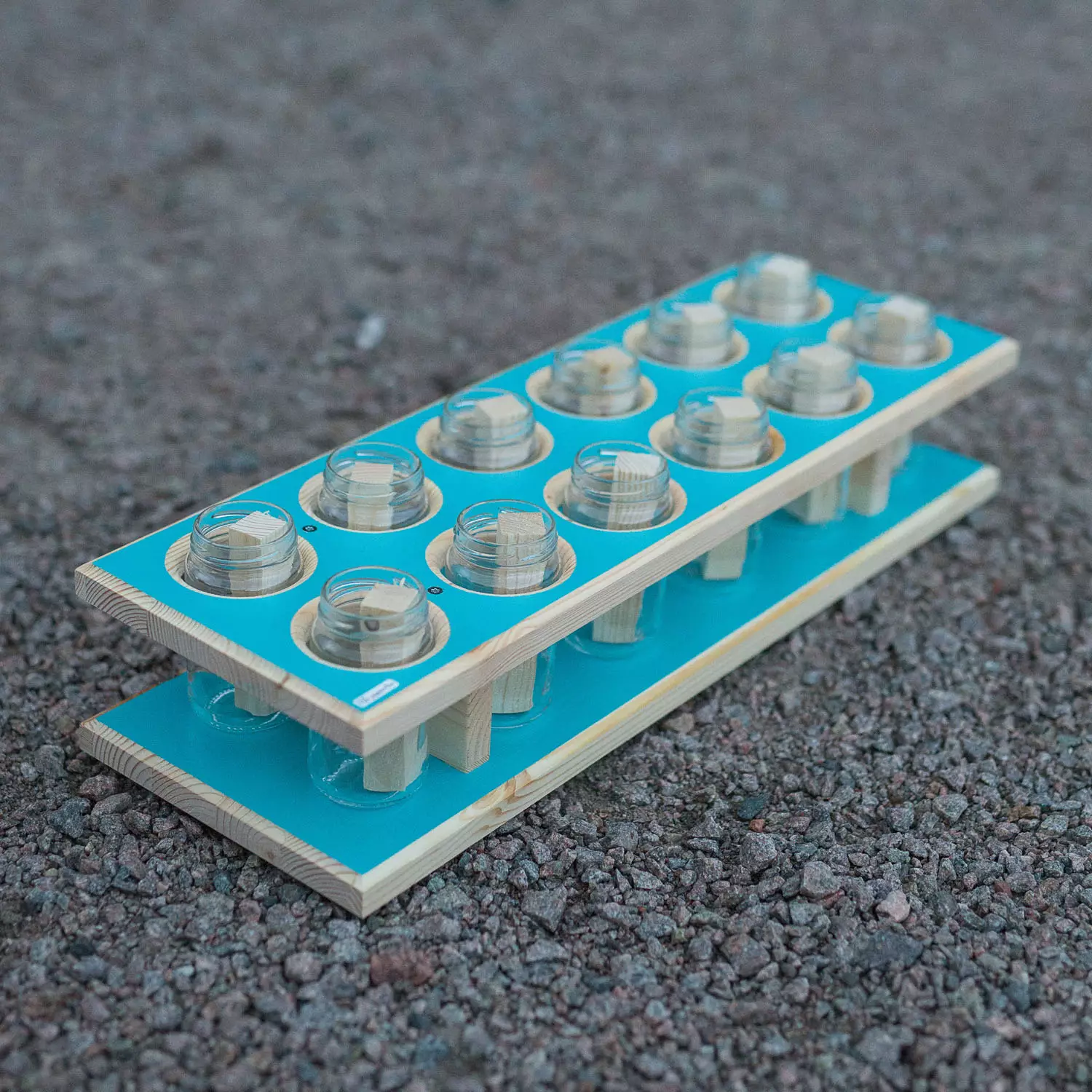 Lasiset purkit on helppo pestä käytön jälkeen, purkkien metallisiin kansiin saa tarvittaessa tehtyä reikiä vaikka naulan ja vasaran avulla. Rataan sisältyy puisen telineen lisäksi kaksitoista lasipurkkia kansineen. Paketti ei sisällä tunnistusnoudon kapuloita.