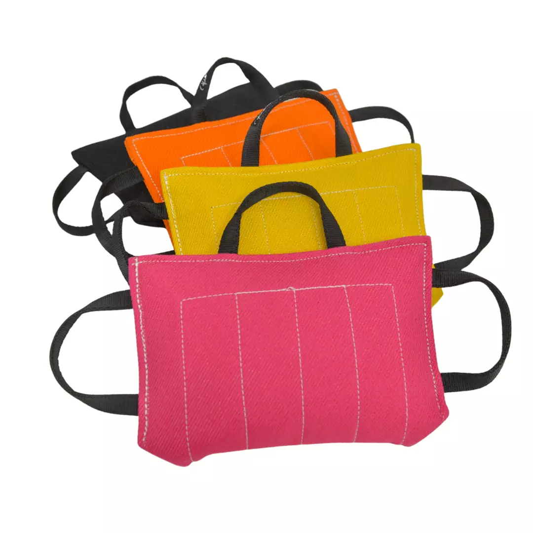 Jämäkän kokoinen purutyyny kolmella kahvalla harrastuskoirille. Sopii erityisesti nuorille koirille palkkaamiseen, saalisleikkeihin ja motivointiin. Koko 32 x 22 cm