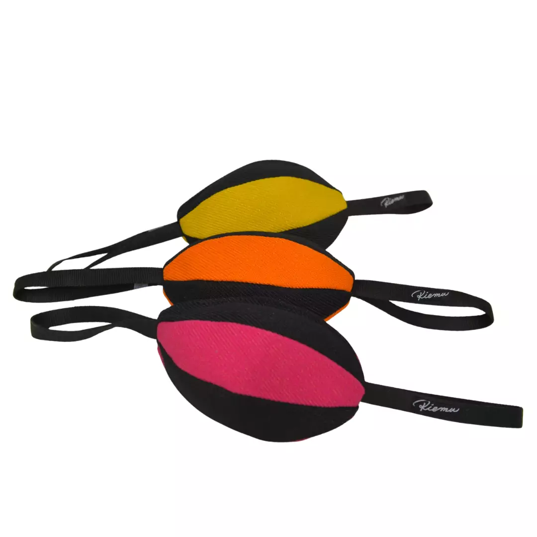 Riemun pehmeä rugby-pallon muotoinen purutyyny on valmistettu miellyttävästä puuvillasekoitemateriaalista. Siinä on kaksi kahvaa, joiden avulla perinteinen palloleikki yhdistyy luontevasti vetoleikkiin.