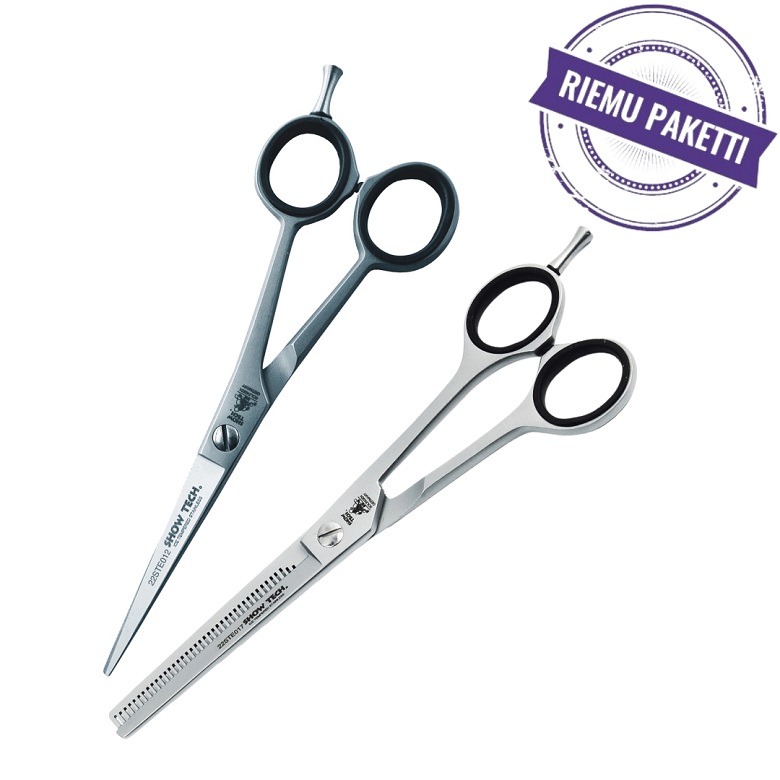 Tämä erinomainen saksipaketti sisältää ohennus ja suorat trimmaussakset, jotka ovat suunniteltu kestämään ammattilaiskäyttöä. Kunnolla leikkaavat sakset ovat helpon ja kauniin trimmin edellytys. Show Tech trimmaussakset valmistetaan käsin Solingenissa, Saksassa. Kaikki mallit on taottu nikkelittömästä ruostumattomasta teräksestä ja karkaistu maksimaalisen kovuuden varmistamiseksi.