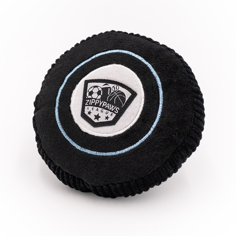 Muhkeankokoinen, napakasta monikerroksisesta kankaasta ommeltu koiran Jääkiekko-pehmolelu jonka sisällä on vinku!