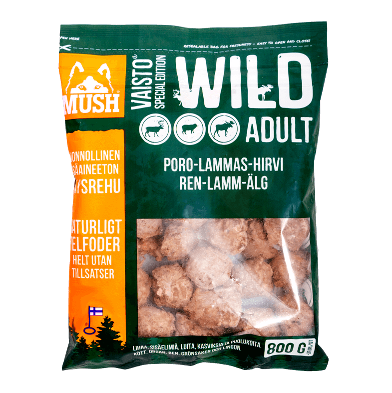 Ainekset: Poro 48% (liha, maha, keuhko, luu, maksa, rusto), Lammas 28% (liha, keuhko, maksa, luu, rusto), Hirvi 19% (liha, rasva, keuhko), kasvikset, marjat ja öljyt 5% (parsakaali, puolukka, kylmäpuristettu auringonkukkaöljy).