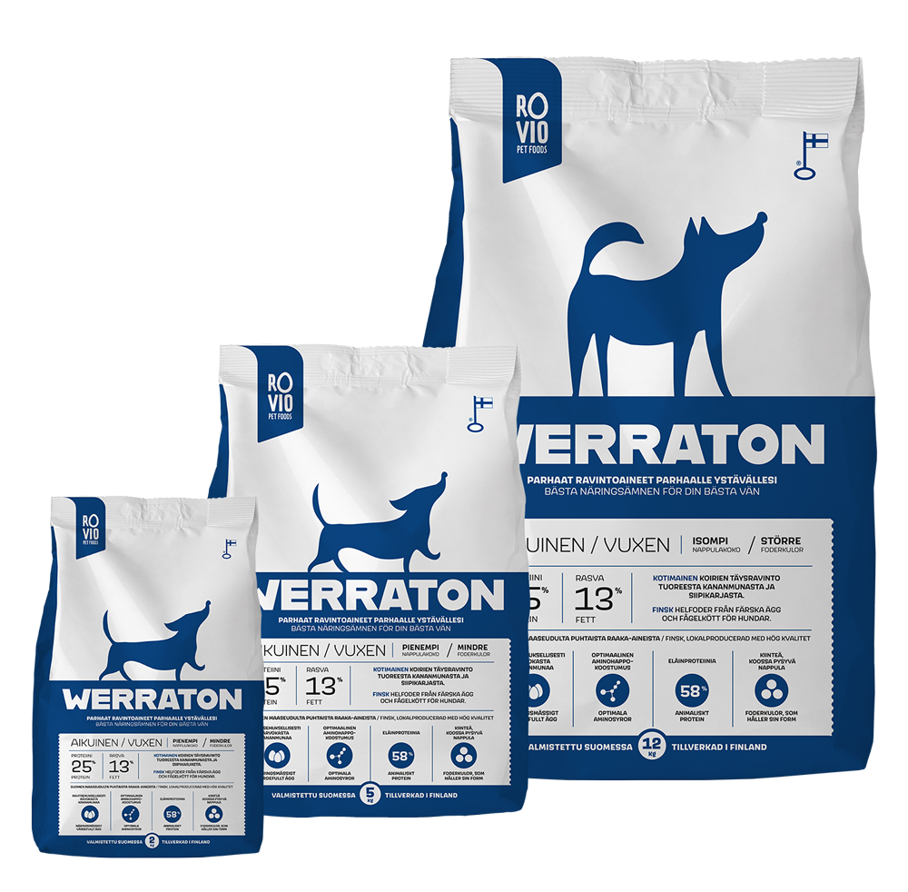 Koirien ravinnontarpeet ovat yksilöllisiä, joten annostelethan Werraton Aikuinen -täysravintoa vastaamaan oman koirasi energiantarvetta, sen lihavuuskuntoa tarkkaillen. Tarvittaessa vaihda ruoka toiseen, paremmin koirasi tarpeita vastaavaan Werraton-kuivaruokaan. Muista, että koiralla on aina oltava raikasta vettä vapaasti saatavilla.