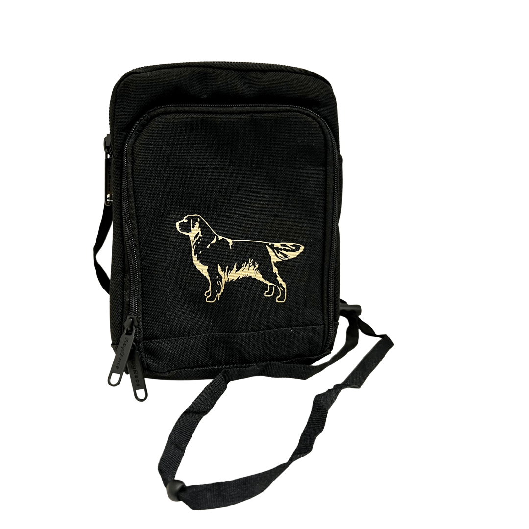 Travel wallet miniolkalaukku naisille ja miehille. Olkalaukun etupuolelle on painettu kultaisennoutajan profiilikuva kullanvärisenä.