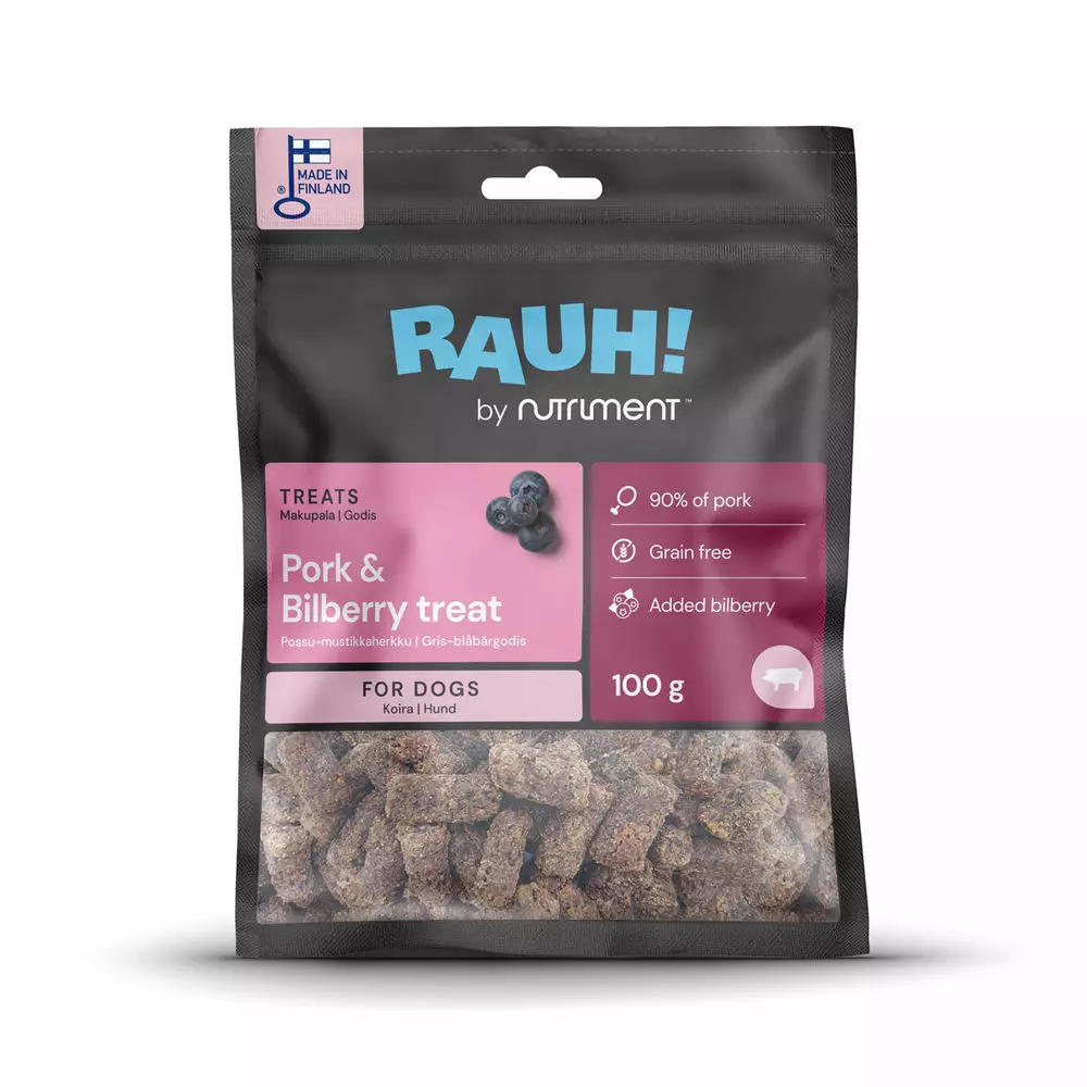 RAUH! Pork-Bilberry Treat 100 g on suomalaisesta lihasta Suomessa valmistettu possumakupala, joka sopii palkkanamiksi tai herkutteluhetkiin niin koirille kuin kissoillekin.