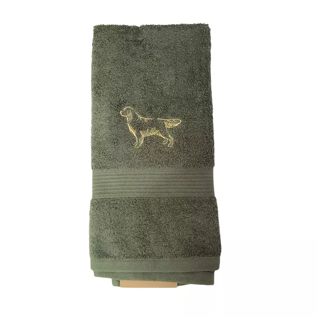 Tassupyyhe kultaisennoutajan profiilibrodeerauksella